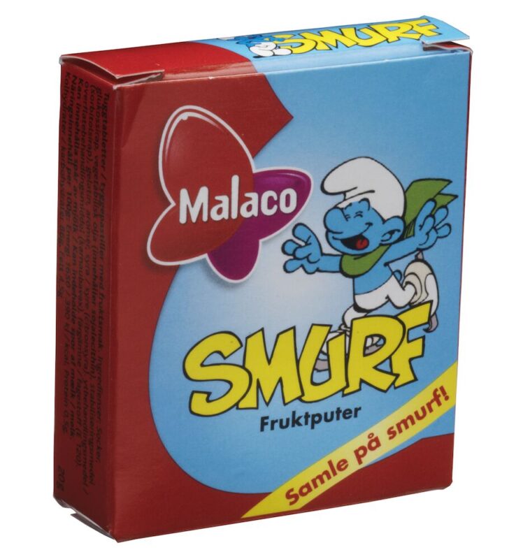 Malaco Smurf Fruktputer er lyserøde seje frugtpuder med en lækker smag af tutti frutti og citron. En ny favorit for de mindste i familien. På æskerne finder du billeder af Smølferne. Slikæsken indeholder 20 gram.